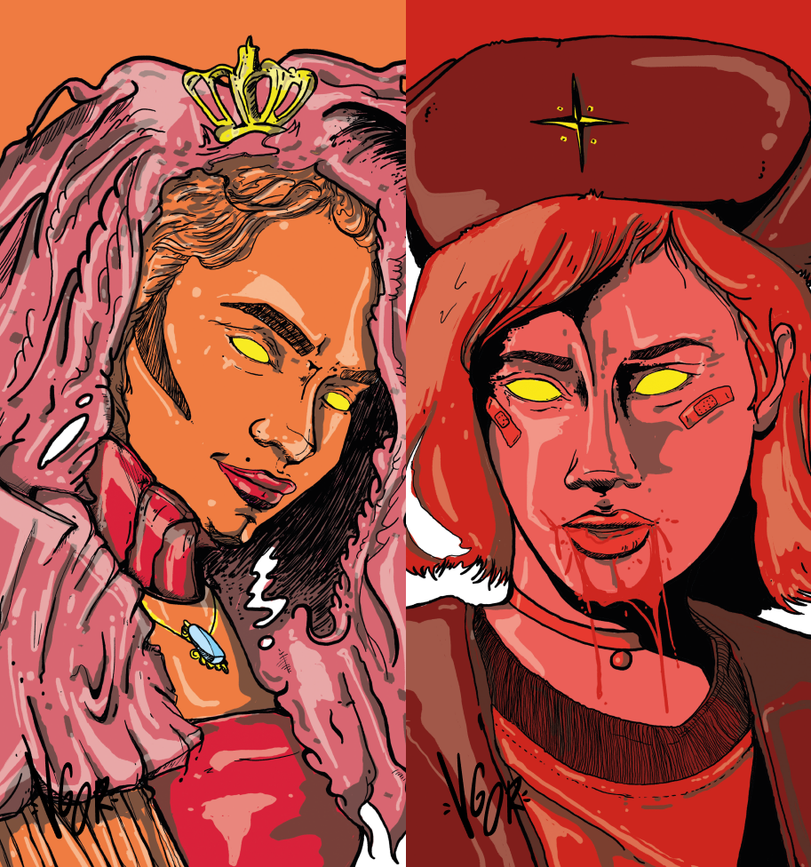 Para o Chá da Rainha, um drink mais suave e refinado, a abordagem foi completamente diferente. Traços delicados e orgânicos, cores suaves como dourado suave, verde menta e toques de lavanda, criam uma atmosfera de elegância e acolhimento. Elementos florais e folhas de chá estilizadas remetem à bebida que inspira o nome, enquanto formas leves e arejadas transmitem a suavidade do paladar. A ilustração convida o espectador a experimentar algo delicado e especial.